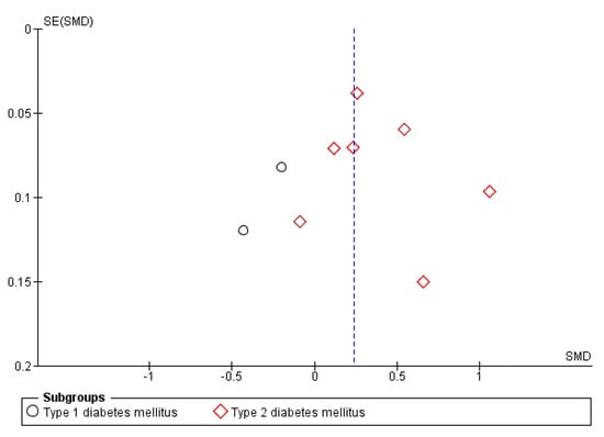 On the contrary, anthropometric variables demonstrated a potential predictive role. Indeed, BMI, reported in 11 included studies, was higher in the studies compared to control groups (p < 0.001), considering both T2DM (p < 0.001) and T1DM (p = 0.030) (Figure 3).