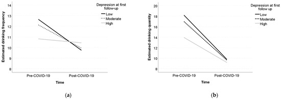 Regarding quantity of alcohol consumed by the participants in the previous two months, the linear mixed-effects model with time as the only fixed predictor to estimate changes in quantity of alcohol consumption revealed an average decrease of 6.44 SDUs between pre- and post-COVID-19 outbreak (Table 3). The linear mixed-effects model that included all predictors revealed a statistically significant main effect of anxiety (b = 0.67, p = 0.023). Those with higher levels of anxiety drank more alcohol before the COVID outbreak. However, a nonsignificant interactive effect between anxiety and time (b = −0.34, p = 0.23) was detected. A significant main effect of depression (b = −0.60, p = 0.012) and an interaction between depression and time (b = 0.52, p = 0.023) were found. As can be seen in Figure 1b, decreases in quantity of alcohol use were less pronounced among those with a relatively high level of depression (b = −4.71, p = 0.003) and more pronounced for those with relatively low (b = −8.32, p < 0.001) or moderate (b = −7.29, p < 0.001) level of depression.