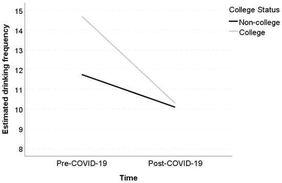 The linear mixed-effects model with time as the only fixed predictor to estimate changes in drinking frequency revealed an average decrease of 3.16 days between pre- and post-COVID-19 outbreak (Table 2). The full linear mixed model with all predictors revealed significant main effects of gender (b = −2.21, p = 0.042) and college status (b = 2.95, p = 0.008) on drinking frequency. Specifically, we found that, at baseline, women drank on average 2.21 days less than men, and college students drank on average 2.95 days more than their noncollege peers. We also found a significant interaction between depression and time (b = 0.36, p = 0.038). As illustrated with the pick-a-point approach (Figure 1a), those with a relatively high depression level (b = −1.10, p = 0.306) did not show a decrease in drinking frequency, while those with a relatively low (b = −2.91, p = 0.014) or moderate depression level (b = −2.18, p = 0.039) exhibited significant declines in drinking frequency. A significant interaction between college status and time (b = −2.75, p = 0.016) was also found (see Figure 2). In particular, a significant decrease in drinking frequency was observed among college students (b = −4.41, p < 0.001), but not among their noncollege peers (b = −1.66, p = 0.107).
