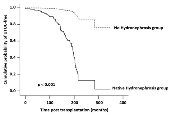Background: Upper urinary tract urothelial carcinoma (UTUC) is the most common malignancy occurring after kidney transplantation (KT) in Taiwan. The aim of this study was to investigate the association between native kidney hydronephrosis and UTUC in post-KT patients. Methods: From 2003 to 2018, we conducted a retrospective cohort study that enrolled 1005 post-KT patients, 67 of whom were subsequently diagnosed with UTUC. We divided patients into two groups based on whether or not they had UTUC. Multivariate analysis and Kaplan-Meier plot were used to evaluate if native kidney hydronephrosis was associated with post-KT UTUC. Results: The total cohort consisted of 612 men (60.9%) and 393 women (39.1%) with a mean age of 48.2 ± 12.0 at KT. The mean follow-up time was 118.6 ± 70.2 months, and mean time from KT to UTUC was 7.53 years. There was a significant gender difference with a female predominance among the UTUC patients (73.1% versus 26.9%, p < 0.001). Native kidney hydronephrosis occurred more frequently in the UTUC group (68.7% versus 4.8%, p < 0.001). Multivariate analysis showed that native kidney hydronephrosis and female gender were significantly associated with UTUC with odds ratios of 35.32 (95% CI, 17.99–69.36; p < 0.001) and 3.37 (95% CI, 1.55–7.29; p = 0.002), respectively. UTUC in the post-KT patients also showed aggressive pathological characteristics and a tendency toward bilateral lesions (41.8%). Conclusions: Native kidney hydronephrosis is significantly associated with post-KT UTUC patients in Taiwan. Native kidney hydronephrosis may be a deciding factor for standard nephroureterectomy and bladder cuff excision in selected patients. Nevertheless, almost half of the patients with kidney hydronephrosis do not present with UTUC at the end of our study.
