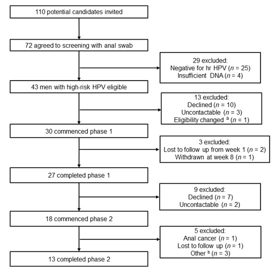 The quadrivalent HPV vaccine (Gardasil, Merck & Co., Whitehouse Station, NJ, USA) was offered to enrolled participants with hrHPV to prevent new infections and was given following the recommended dose and schedule at 0, 2 and 6 months. The study was approved by the Alfred Hospital Ethics Committee, Melbourne, Australia (473/17). The study was conducted in compliance with the regulatory requirements, good clinical practice (GCP) and the ethical principles of the Declaration of Helsinki as adopted by the World Medical Association and reported as per the CONSORT 2010 Guidelines. This trial was registered at the Australian New Zealand Clinical Trials Registry (ACTRN12617001355369) on 27 September 2017.