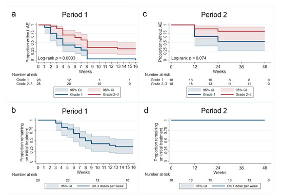 Kaplan–Meier Survival curves demonstrating time to adverse events in period 1 and period 2. (a,c) demonstrate the proportion of men in period 1 and period 2 who remained without adverse events over the corresponding study periods, as well as those who developed grade 1 (blue line) and grade 2 or 3 adverse events (red line). (b,d) demonstrate the proportion of men who remained on the initially prescribed imiquimod treatment in period 1 (3 doses per week) and period 2 (1 dose per week).