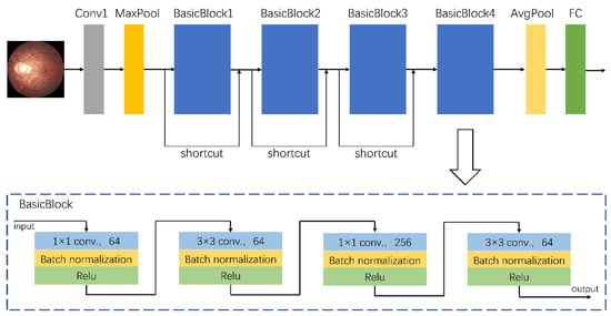 A total of 758 fundus images from dataset A were used to train the assisted diagnostic model. The trained DCNNs model can be used to efficiently obtain diagnostic results, i.e., for an input fundus image, the model automatically outputs the category to which the image belongs, namely the risk level of high myopia as predicted by the model. As the clinical data were collected from different camera instruments, the image resolution varied. Therefore, we first adjusted the size of all images to 224 × 224 for normalization, and carried out a series of preprocessing operations to enhance feature expression. These preprocessing operations mainly consisted of the following steps: quality assessment, contrast enhancement, image denoising, mean normalization, and variance normalization. Thereafter, we used the designed DCNNs for feature extraction and classification. The architecture of our proposed DCNNs is shown in Figure 1. Its basic network structure includes a convolution layer, a maximum/average pooling layer, a batch normalization layer, an activation layer, and a fully connected layer. Because the sample size of dataset A (which was used for training) was relatively small, there was a high risk of overfitting when the network model had too many parameters or too many layers. That is to say that when the accuracy of a network model on the training set is very high but the accuracy on a new dataset that has not been seen is very low, it does not have a powerful generalization ability. Therefore, the proposed DCNNs are mainly composed of a head convolution layer Conv1 and four continuous convolution modules named BasicBlocks. There are additional shortcut connections between the four convolution modules. Adding a shortcut connection is equivalent to adding all the information of the image of the previous layer in each block. To some extent, more original information is retained, and the possibility of a vanishing gradient problem in back propagation can be reduced. The final output of the fully connected layer was changed to three categories to accommodate the risk classification task of this study.