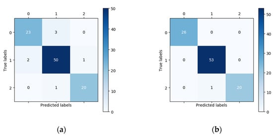 Comparison of the classification performance of the DCNNs and the human expert in the external validation of dataset B. The results are shown as a confusion matrix in which the vertical axis represents the true labels and the horizontal axis represents the predicted labels. (a) The confusion matrix of the human expert. (b) The confusion matrix of the DCNNs.