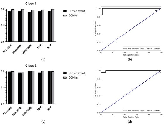 Evaluation results in the external validation dataset B. (a) Accuracy, sensitivity, specificity, PPV, NPV of the recognition of class 1; (b) ROC curves and AUC value of the recognition of class 1; (c) accuracy, sensitivity, specificity, PPV, NPV of the recognition of class 2; (d) ROC curves and AUC value of the recognition of Class 2.