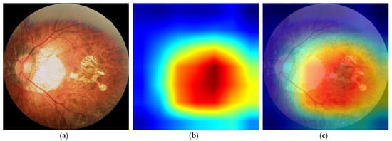 As shown in Figure 5, we used gradient activation heatmap Grad-CAM++ to analyze the fundus image area. From left to right, we can see the original fundus image, the corresponding heatmap, and the corresponding gradient activation heatmap (Grad-CAM++) superimposed on the original image area. The warmer the color in the heatmap, the greater the influence on the classification prediction result. Figure 5a shows a high-risk high myopia fundus image with severe lesions, including diffuse chorioretinal atrophy, patchy chorioretinal atrophy, and macular atrophy. We can see that the DCNNs mainly focused on the macular area and the area of choroidal atrophy, rather than the background or other parts in the fundus.