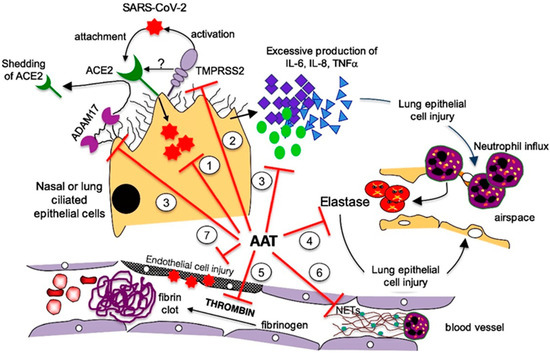 AAT, encoded by the SERPINA1 gene, is an acute-phase glycoprotein that is mainly synthesized and secreted by hepatocytes and is the main serum protease inhibitor. However, other cell types can also express this protein. A study by Van’t Wout et al. demonstrated that AAT is produced by differentiated monocyte-derived macrophages, monocyte-derived dendritic cells, and alveolar macrophages [9]. NE, an enzyme responsible for the proteolytic degradation of lung elastase and alveolar and interstitial lung tissue, and AAT, which primarily acts as an inhibitor of the serine protease, act in concert to maintain protease–anti-protease homeostasis, thus protecting the lung tissue from proteolytic digestion [10]. AAT also has anti-coagulation effects and can protect against inflammation, cell death, and the formation of neutrophil extracellular traps (NETs) [11]. Notably, AAT has the capacity to bind and inhibit the SARS-CoV-2-priming protease, transmembrane serine protease 2 (TMPRSS2), on host cells, thus inhibiting the first step in the SARS-CoV-2 cell cycle [12].