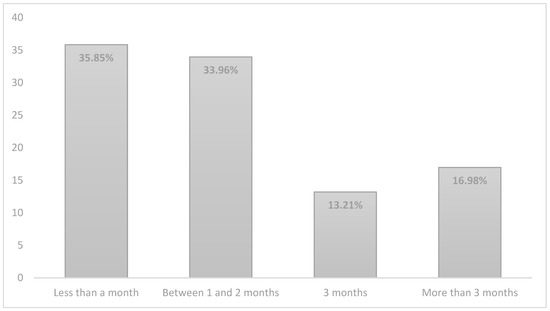 Regarding the questions of the second block ‘hospital stay’, the results showed that the majority of parents (77.4%) had to stay at the hospital for less than a month. However, the average length of time that the children were hospitalised was between 1 and 2 months (Figure 1). This means that the baby had to stay in the hospital and the parents had to visit them.