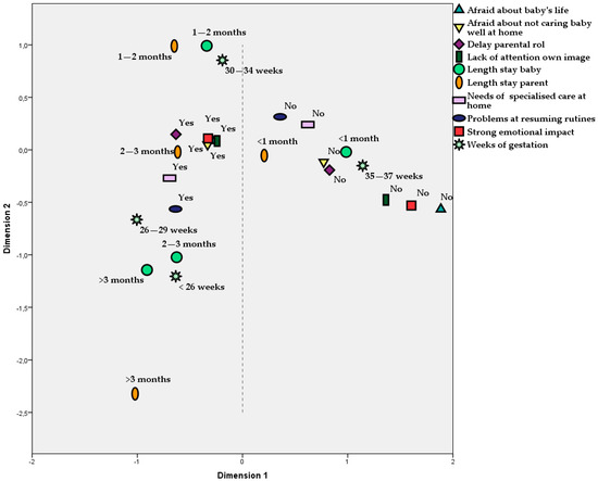 Figure 4 summarises all of these correlations obtained with the MCA. The proximity between figures corresponds to a positive association. We can see, on one hand, that all negative answers are located on the right side of the plot, near to figures corresponding to 35–37 weeks of gestation and under one month of stay at the hospital. On the other hand, affirmative answers, corresponding to emotional impact, are very close to the left side, linked to gestation under 35 weeks and longer hospitalizations.