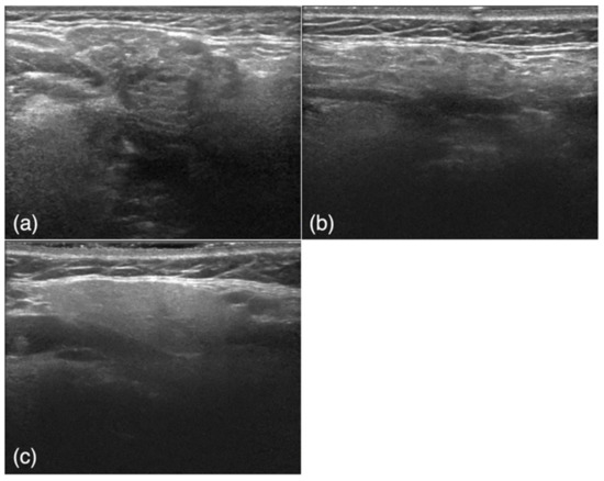 Examples of ultrasound images. (a) A patient in the obstructive sialoadenitis group shows inhomogeneous parenchyma and well-defined margins. (b) A patient in the Sjögren’s syndrome group shows inhomogeneous parenchyma characterized by multiple diffuse anechoic regions and ill-defined margins. (c) A patient in the control group shows homogeneous parenchyma and well-defined margins.