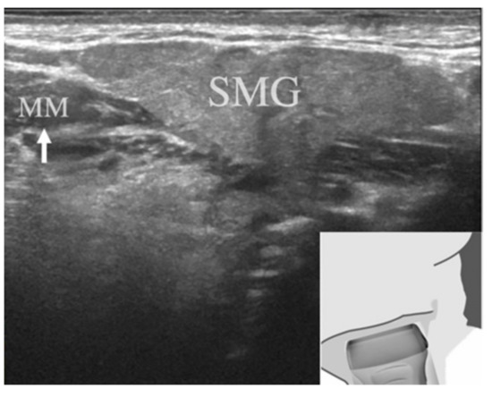 Illustration of right submandibular gland imaging. The submandibular gland was located in the center of the region of interest, and the mylohyoid muscle was located in the anterior-lower part of the submandibular gland (white arrow). MM, mylohyoid muscle; SMG, submandibular gland.