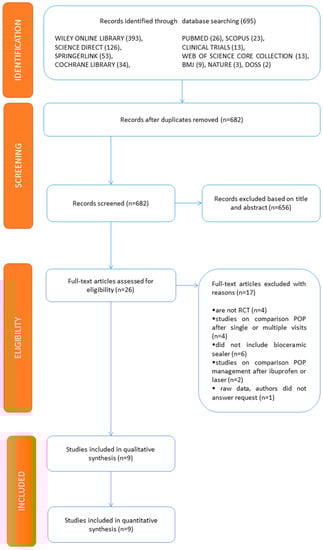 The search strategy identified 695 records, including 13 duplicates. The remaining 682 records were screened by the title and abstract (Figure 1). In total, 656 records were considered irrelevant and removed, leaving 26 studies that were assessed for eligibility by full-text reviewing. At this stage, 17 studies were excluded [11,12,13,14,15,16,17,18,19,20,21,22,23,24,25,26,27], most commonly since they did not include a BCS (Supplementary Materials Table S1). Finally, nine studies were included for systematic review. Although each of the selected studies evaluated the POP level following different filling techniques, the variability within the study designs and the materials and methods employed required specific consideration during the analysis.