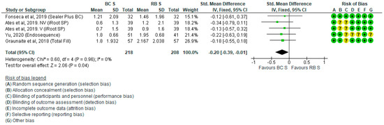 In this analysis, we found that BCS was non-significantly correlated with reduced analgesic intake vs. RBS, an observation that was also reported by one of the included studies [35] using the warm-obturator filling technique. However, two of the other included RCTs [32,33] demonstrated comparable analgesic intake in the control and experimental groups after RCF using SCT.