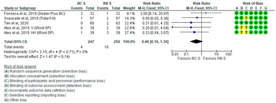 The effect of the obturation technique (WVT vs. SCT) on POP based on data 24 h and 48 h after RCF is presented in Supplementary Materials Figures S4 and S5. The studies that did not report 48-h data were excluded. There was a numerical difference in POP in favor of BCS for both WVT and SCT subgroups 24 h after RCF (OR = 0.85; P = 0.41). The probability of POP was numerically higher in the RBS subgroup that underwent the WVT technique (P = 0.49) in 1.2× and lower in the BCS subgroup that underwent the SCT technique (P = 0.64; Supplementary Materials Figure S4). There was evidence of lower POP in both WVT and SCT subgroups of the BCS group 48 h after RCF (P = 0.33). The probability of POP did not differ according to the obturation technique in the BCS group, but was 1.3× higher in the RBS group 48 h after RCF (OR = 0.78; P = 0.33; Supplementary Materials Figure S5).