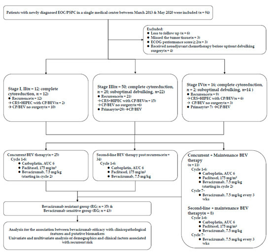 - Tewari, K.S.; Burger, R.A.; Enserro, D.; Norquist, B.M.; Swisher, E.M.; Brady, M.F.; Bookman, M.A.; Fleming, G.F.; Huang, H.; Homesley, H.D.; et al. Final Overall Survival of a Randomized Trial of Bevacizumab for Primary Treatment of Ovarian Cancer. J. Clin. Oncol. 2019, 37, 2317–2328. [Google Scholar] [CrossRef]