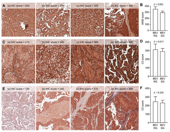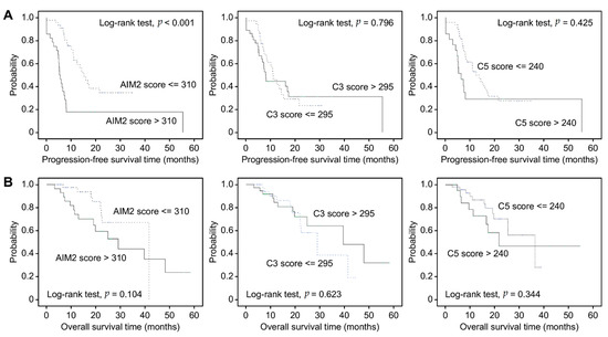 3.3. Predictive Associations between IHC Scores for AIM2, C3, and C5 in Tumor Cells and Survival Outcome
