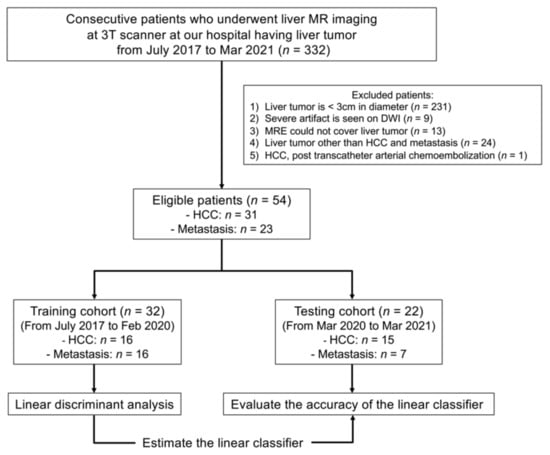 Between July 2017 and March 2021, 332 liver tumor patients underwent liver MR imaging, including MRE, DWI (b values, 0 and 800 s/mm2), and DWI-based VMRE (b values, 200 and 1500 s/mm2) at our hospital. We excluded patients who met the following exclusion criteria: (a) tumor diameter < 3 cm (n = 231), (b) severe artifacts on DWI (n = 9), (c) tumors outside (n = 9) or inside the cross-hatched area in the stiffness map in MRE (n = 4), (d) liver tumor other than HCC and metastases (n = 24), and (e) HCC treated by transcatheter arterial chemoembolization (n = 1). The limit on tumor size (3 cm) was set based on the limited spatial resolution of MRE and the presence of artifacts. Below 3 cm tumors are not masses, but nodules which are hard to detect with standard MRE, hence nodules were excluded. In total, the final study population included 54 patients (mean ± standard deviation age: 69.4 ± 9.3 years, range: 47–87 years, HCC: n = 31, metastases: n = 23) (Figure 1, Table 1). Out of the 54 patients, 32 patients (from July 2017 to February 2020, HCC: n = 16, metastases: n = 16) were randomly assigned to define a training cohort, and the remaining 22 patients (from March 2020 to March 2021, HCC: n = 15, metastases: n = 7) were assigned to a testing cohort to assess the performance of a linear discriminant analysis based on its capacity to differentiate HCC from metastases. VMRE was also evaluated in the liver parenchymas of 45 of these patients (we could not calculate the liver parenchymas in nine patient cases because of severe artifacts on the DWI in the parenchyma). MR images were analyzed by two radiologists (board-certified with nine years of experience each in abdominal imaging) who were blinded to the diagnosis.