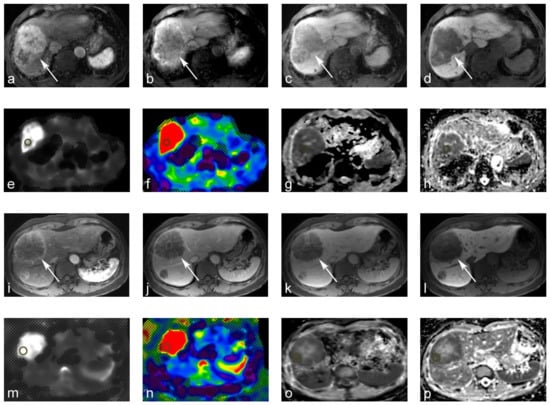 69-year-old male with moderately differentiated hepatocellular carcinoma (HCC). (a–d) Gd-EOB-DTPA-enhanced magnetic resonance image (MRI): (a) tumors show arterial hyperenhancement on the arterial-phase. (b,c) Tumor shows a washout on the portal venous and transitional phase; (d) tumor shows a hypointensity on the hepatobiliary phase. (e,f) MR elastography (MRE). The tumor yielded a stiffness of 10.71 kPa on the MRE. (g,h) Apparent diffusion coefficient (ADC) maps. The tumor yielded a value of 0.63 × 10−3 mm2/s on the shifted ADC (sADC) map, and a value of 0.93 × 10−3 mm2/s on the ADC map. 60-year-old male with metastatic hepatic cancer from colorectal cancer. (i–l) Gd-EOB-DTPA-enhanced MRI. (i,j) Tumor showed rim-like enhancements on the arterial and portal venous phase. (k,l) The tumor was hypointense on the transitional and hepatobiliary phases. (m,n) MRE. The tumor yielded a stiffness of 15.59 kPa on MRE. (o,p) ADC maps. The tumor also yielded an sADC value of 0.72 × 10−3 mm2/s on the sADC map, and 0.86 × 10−3 mm2/s on the ADC map.