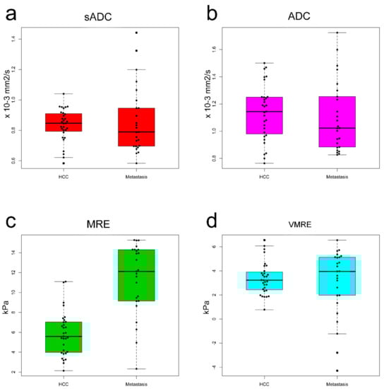 This potentially important finding may be beneficial for many patients because sADC and MRE do not require contrast agents. Differential diagnosis of metastatic liver tumors from primary liver tumors is usually obtained with contrast-enhanced MRI. Recently, imaging techniques have become the mainstay for the assessment of liver lesions, somewhat alleviating the need for biopsy sampling []. Besides the invasiveness of biopsy sampling, which is associated with procedural risks and patient discomfort, only limited areas can be sampled []. There is a need to achieve a similar level of performance noninvasively. Based on our results, we believe that the combination of sADC and MRE could be an alternative to biopsy sampling.