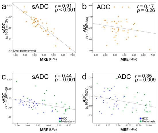 The correlations between µMRE and the sADC values were strong and significant for the liver parenchyma, HCCs, and metastases. Specifically, for the liver parenchyma, r = 0.91 (p < 0.001); malignant tumors, r =0.44 (p = 0.001); HCC, r =0.68 (p < 0.001); and for metastases, r = 0.71 (p < 0.001) (Figure 4). The correlation between µMRE and ADC was weaker, and significant only for malignant tumors and metastases: liver parenchyma, r = 0.17 (p = 0.26); malignant tumors, r = 0.35 (p = 0.009); HCC, r = 0.20 (p = 0.29); metastases, r = 0.55 (p = 0.005) (Figure 4).