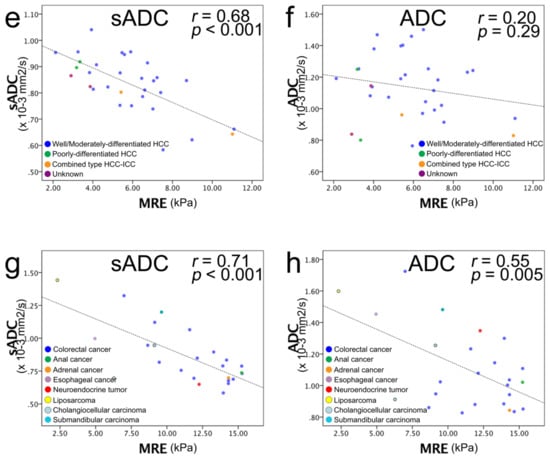 Scatter plots of MRE shear modulus (µMRE; kPa) (horizontal line) versus ADC value (vertical line). (a) sADC versus µMRE of liver parenchyma and (b) ADC versus µMRE of liver parenchyma. (c) sADC versus µMRE of the entire liver tumor and (d) ADC versus µMRE of HCC and metastasis: blue dots, HCC; green dots, metastasis. (e) sADC versus µMRE of HCC, and (f) ADC versus µMRE of HCC: blue dots, well/moderately differentiated HCC; green dots, poorly differentiated HCC; yellow dots, combined type HCC–ICC; purple dots, unknown histology. A strong correlation was observed between sADC and µMRE, and no correlation was observed between ADC and µMRE. (g) sADC versus µMRE of metastasis and (h) ADC versus µMRE of metastasis: blue dots, colorectal cancer; green dots, anal cancer; orange dots, adrenal cancer; purple dots, esophageal cancer; red dots, neuroendocrine tumor; yellow dots, liposarcoma; light blue dots, cholangiocelluar carcinoma; turquoise blue dots, submandibular carcinoma. A strong correlation was observed between sADC and µMRE, and a moderate correlation was observed between ADC and µMRE. The black dashed line corresponds to the linear regression of sADC/ADC versus the MRE values, and not to the VMRE calibration line, which was calculated from the symmetric correlation of the MRE values with ln(S200/S1500), according to Equation (3).