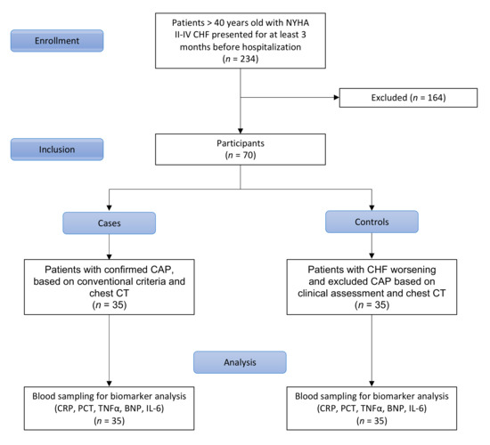 The study comprised 70 patients, aged over 40 years, from a hospitalized pool, between September 2013 and September 2014. The inclusion process is presented in Figure 1. Consecutive class II–IV CHF individuals for at least 3 months before hospitalization and supported by previous medical documentation were included. CAP diagnosis was based on complex clinical assessment by the experienced clinician in line with national guidelines [19]. Thirty-five non-severe CAP patients defined by (1) a new pulmonary infiltrate on chest CT, (2) acute fever >38.0 °C) and (3) at least one of the following symptoms or signs: cough (productive or nonproductive), dyspnea, respiratory chest pain, crackles or reduced respiratory sounds, were recruited during the period. Meanwhile, 35 persons without CAP but having signs and symptoms of worsening CHF were assigned to the control group for a comparative study (Ratio 1:1). The control group was matched to cases on age (within 5 years). Patients with CAP were considered cases, persons without CAP but having signs and symptoms of CHF decompensation were seen as controls.