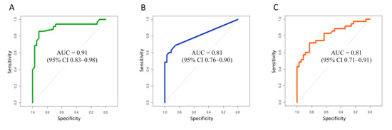After performing regression analyses using five individual models for each predictor, CRP (p = 0.0001), PCT (p = 0.042) and IL-6 (p = 0.003) demonstrated significant associations with the presence of CAP, while TNFα (p = 0.092) and BNP (p = 0.339) did not bear any relationship to this diagnosis. Figure 3A–C display ROC curve analysis results, showing discriminatory abilities for the promising biomarkers (CRP, PCT and IL-6). Quantitatively, we obtained the following AUC measures: 0.91 (95% CI 0.83–0.98) for CRP, 0.81 (95% CI 0.72–0.90) for PCT and 0.81 (0.71–0.91) for IL-6. Thus, the diagnostic accuracy of CRP can be considered excellent (AUC ≥ 0.90), while PCT and IL-6 demonstrated good discrimination (AUC ≥ 0.80).