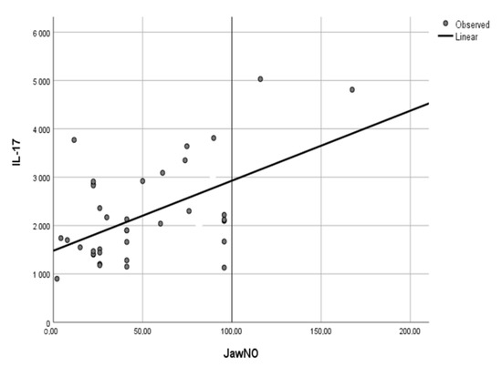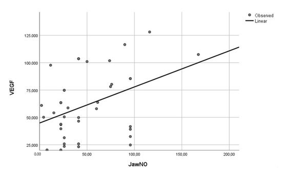 Significant correlations were found between FeNO 50 mL/s and IL-17 (r = 0.467, p = 0.049), IL-1 (r = 0.841, p = 0.036) and VEGF (r = 0.754, p = 0.044). JawNO levels positively correlated with IL-6 (r = 0.502, p = 0.042), IL-17 (r = 0.796, p < 0.001) (Figure 1) and VEGF (r = 0.761, p = 0.001) (Figure 2) (Table 4). No correlations were found between FeNO 50 mL/s as well FeNO 150 mL/s and Th2-related cytokines (data not shown).