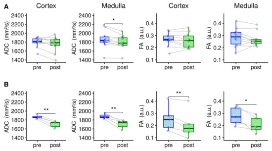 Boxplots of cortical and medullar apparent diffusion coefficient (ADC) and fractional anisotropy (FA) values pre- and post-XCM. Patients were divided into two groups (non-Contrast-Induced Nephropathy (non-CIN), n = 10 (A); CIN, n = 5 (B)). Points indicate the values for each individual and boxplots represent the mean over all patients of the group. Lines connecting the individual points represent the pre/post ADC and FA difference of the single patients. For the non-CIN group, only pre- and post-medullar ADC values were significantly different (* p < 0.05). All other diffusion parameters of the non-CIN patients did not differ significantly pre- and post-XCM administration. A significant drop of all diffusion parameters was identified for the CIN group (* p < 0.05). ** p < 0.01.