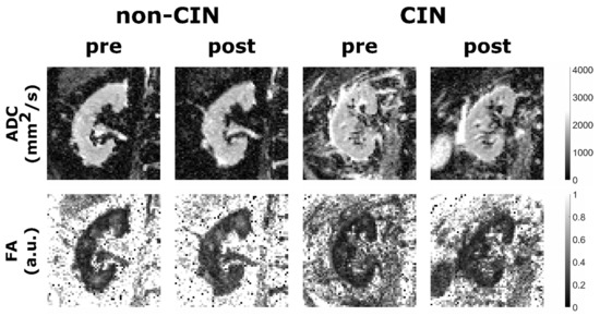 In conclusion, one of the main issues in management of CIN is still unsolved: the delayed diagnosis of CIN after 48–72 h, during which time renal damage has already progressed. Diagnostic tools identifying high-risk CIN patients with still reversible renal damage might improve the outcome of these patients and reduce the aforementioned clinical “renalism”. Non-invasive, functional renal MRI biomarkers might be a promising approach in this regard [25]. In particular, diffusion weighted imaging (DWI) and diffusion tensor imaging (DTI) have been shown to potentially reflect acute changes in renal microstructure in animal and human studies [26,27].