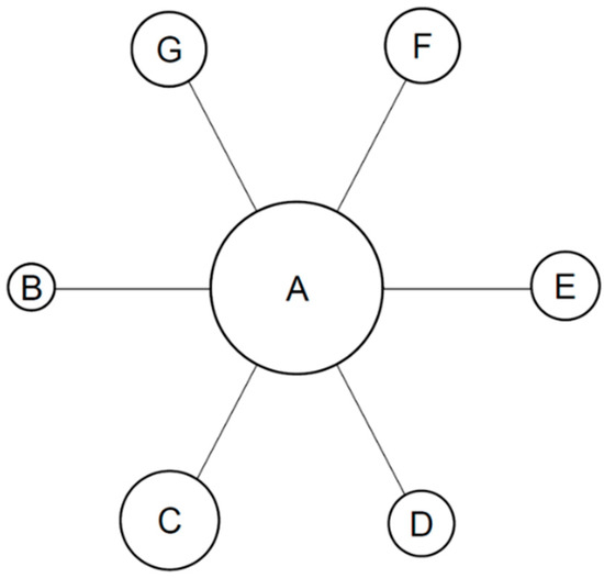 Star shaped network diagram generated in this safety MA. Only direct comparisons of immunotherapies versus overall chemotherapy as common comparator are shown. A = common comparator, platinum-based chemotherapy control group; B = KEYNOTE-024 (pembrolizumab); C = KEYNOTE-042 (pembrolizumab); D = CheckMate 026 (nivolumab); E = IMpower110 (atezolizumab); F = MYSTIC (durvalumab) and G = EMPOWER-Lung 1 (cemiplimab). Circle size is proportional to the number of patients receiving the specific treatment in each clinical trial included in the NMA.