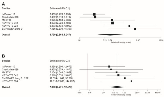 Forest plot of pooled risk ratios (RR) for (A) any grade irAEs and (B) grade 3–4 irAEs, in patients treated with anti-PD-1 or anti-PD-L1 immunotherapy compared to platinum-based chemotherapy. Estimate, RR; CI: confidence interval. Treatments are presented top to bottom by lower to higher RR. Black squares indicate the weight of each RCT in the MA. The black rhomb indicates the weighted overall RR for immunotherapy versus chemotherapy. The I2 index values measuring the heterogeneity of effect-size estimates from the in-dividual studies in MAs A and B correspond respectively to: (I2 = 68.48%, p = 0.007) and (I2 = 0%, p = 0.804).