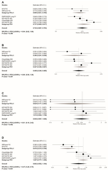 Forest plot of pooled risk ratios (RR) in the subgroup analysis((anti-PD-L1) versus (PD-1 inhibitors)) for: (A) any grade trAEs; (B) grade 3–4 trAEs (C) grade 5 trAEs; (D) AEs leading to discontinuation. Estimate, RR; CI, confidence interval. RR of ((anti-PD-L1) versus (PD1 inhibitors)) is shown at the bottom left. Treatments are ordered from top to bottom by lower to higher RR. Black squares indicate the weight of each RCT in the MA. The black rhomb indicates the weighted overall immunotherapy RR versus chemotherapy. Grey rhombs indicate, respectively, the weighted RR for anti-PD-1 immunotherapy subgroup compared to chemotherapy, and the weighted RR for anti-PD-L1 immunotherapy subgroup versus chemotherapy. The I2 index values measuring the heterogeneity of effect-size estimates from the individual studies in MAs A to D correspond respectively to: (I2 = 74.15%, p = 0.002); (I2 = 61.78%, p = 0.023); (I2 = 0%, p = 0.954); and (I2 = 67.83%, p = 0.008).