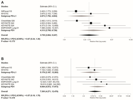 Forest plot of pooled risk ratios (RR)in the subgroup analysis((anti-PD-L1) versus (PD-1 inhibitors)) for: (A) any grade irAEs; and (B) grade 3–4 irAEs Estimate, RR; CI, confidence interval. RR of ((anti-PD-L1) versus (PD1 inhibitors)) is shown at the bottom left. Treatments are ordered from top to bottom by lower to higher RR. Black squares indicate the weight of each RCT in the MA. The black rhomb indicates the weighted overall immunotherapy RR versus chemotherapy. Grey rhombs indicate, respectively, the weighted RR for anti-PD-1 immunotherapy subgroup compared to chemotherapy, and the weighted RR for anti-PD-L1 immunotherapy subgroup versus chemotherapy. The I2 index values measuring the heterogeneity of effect-size estimates from the individual studies in MAs A and B correspond respectively to: (I2 = 68.48%, p = 0.007) and (I2 = 0%, p = 0.804).