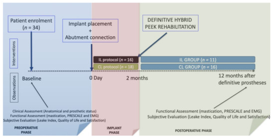The diagram of the observations and interventions carried out in this study is shown in Figure 1. In the pre-operative phase, patients were explored to record the baseline clinical, functional and subjective data. In this regard, the chewing ability was evaluated by registering the self-reported difficulty in chewing five target foods (apple, salads, meat, boiled vegetables, and carrots) according to the Leake Index [21]. Moreover, data regarding self-reported satisfaction on a visual analog scale [22] and the oral health-related quality of life according to the Spanish version of the OHIP-20 (Oral Health Impact Profile) [19] were also gathered. This OHIP-20 [19] is specifically useful to quantify the impact of oral conditions edentate across seven domains, i.e., functional limitation, pain, psychological discomfort, physical disability, psychological disability, social disability, and handicap. The frequency responses of the 20 items were coded numerically from 0 = never to 4 = very often as Likert scales. The total scores of the OHIP-20 were calculated by simply counting the number of items recorded as occasionally or more frequently (≥2). Hence, the OHIP-20 summary score ranged from 0 to 20.