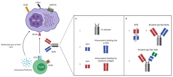 A schematic overview of different formats of bispecific antibodies used to initiate redirected lysis of multiple myeloma cells by T cells. Bispecific antibodies (BsAbs) bind simultaneously with one arm to CD3 expressed on T cells and with the other arm to a tumor-associated antigen (TAA) on the MM cell surface. This includes BCMA, CD38, FcRH5, and GPRC5D. The interaction leads to activation and degranulation of T cells (release of granzymes/perforins) and subsequent lysis of MM cells. (A,B) Next to the bivalent IgG-like BsAbs, bispecific T cell engagers (BiTEs) and trivalent IgG-like trispecific antibodies (TsAbs) are also able to mediate T cell-dependent lysis of MM cells. (A) (1) An Fc domain that connects two antigen-binding domains in IgG-like BsAbs and TsAbs. (A) (2) T cell binding domain that consists of an scFv with a monovalent binding site for CD3. (A) (3) Tumor cell-binding domain that consists of an scFv with a monovalent binding site for MM-associated antigen. (B) (1) A bispecific T cell engager (BiTE) that is comprised of two different scFvs connected with a peptide linker (e.g., AMG420). (B) (2) A bivalent IgG-like BsAb comprised of an Fc domain and two monovalent binding domains. (B) (3) A trivalent IgG-like TsAb comprised of an Fc domain and three monovalent binding domains including a binding domain for a third antigen (e.g., CD28).