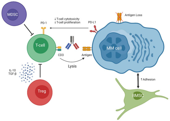 A schematic overview of different resistance mechanisms that impair BsAb-induced T cell-mediated lysis of MM cells. BMSC = Bone marrow stromal cell; MDSC = Myeloid-derived suppressor cell; MM cell = Multiple myeloma cell; Treg = regulatory T cell.