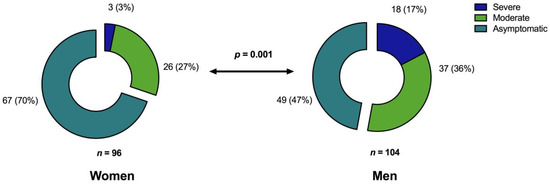 Proportion of COVID-19 severity levels in relation to patient sex [n (%)]. Chi-square (χ2) test for trend indicated that men experience significantly more severe COVID-19 than women (p = 0.001) according to the clinical classification of severity.