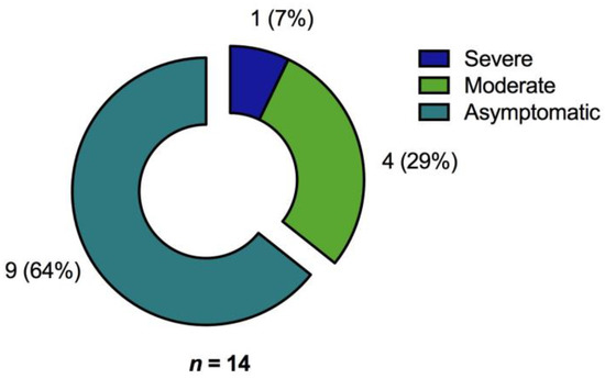 For 14 patients (7%; patients per group: asymptomatic or mild disease, n = 9; moderate disease, n = 4; severe disease, n = 1, Figure 4) no response to any (S and M protein) of the tested SARS-CoV-2 proteins was detected by the ELISpot assay.