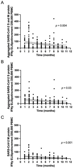 The aggregated number of SARS-CoV-2 specific T cell responses in the entire population decreased with increases in time since primary infection (Figure 5A). Similar results were obtained when the S and M peptide pools were analyzed separately (Figure 5B,C).