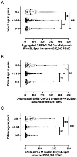 Aggregated IFNy ELISpot increment for SARS-CoV-2 Spike (S) and Membrane (M) protein specific T cell responses (A), aggregated number of S protein specific T cell responses (B), and M protein specific T cell responses (C), with respect to patient age. ** p < 0.005; * p < 0.05; ns not significant.