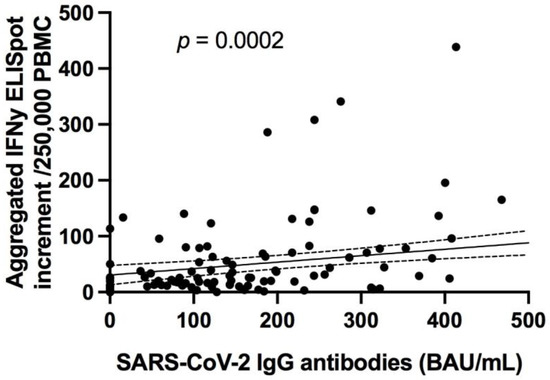 Correlation of SARS-CoV-2 IgG antibodies against S proteins and aggregated SARS-CoV-2 specific T cell responses in the ELISpot assays. p = 0.0002; R = 0.3, regression line (black line) with 95% confidence interval (dashed lines).