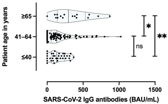 SARS-CoV-2 immunoglobulin G (IgG) antibodies by age (years). ** p < 0.005; *, p < 0.05; ns, not statistically significant.