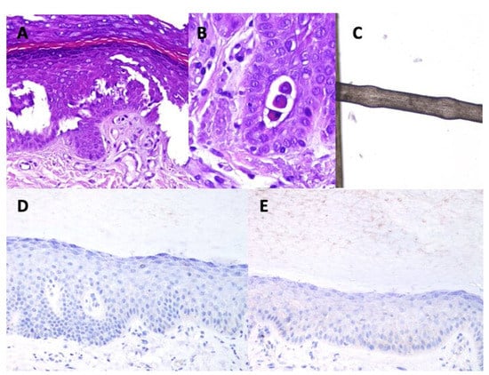 Main findings in the immunohistochemistry study. (A): acantholytic areas evidenced in case 9 (Hematoxylin-Eosin ×200). (B): Acantholytic round cells. Some desmosomes (spines) are still observed between the round cells and adjacent keratinocytes (hematocillin-eosin ×400). (C): monilethrix. (D): negative expression of desmoplakin in case 4 (×200). (E): weak expression of desmoplakin in case 6 (×200).
