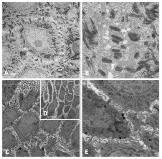 In transmission electron microscopy analysis of skin biopsies, 50% of patients showed that keratinocytes of the spinous layer had a normal structure, characterized by a polygonal/elongated morphology with abundant bundles of tonofilaments (keratin filaments) in the cytoplasm, sometimes associated with masses of keratohyalin (Figure 3A). In these samples, desmosomes showed normal ultrastructural features with the presence of undisturbed electron-dense midline, inner plaques and keratin filament junctions (Figure 3B). For the other 50% of patients, ultrastructural analysis of the spinous layer showed an enlargement of the intercellular space between keratinocytes and an increase in the length of the cytoplasmic bridges (Figure 3C,D), as was found in the histological analysis of the samples. In these cases, a decrease in the number of desmosomes was observed, although they showed an unaffected structure (Figure 3E).