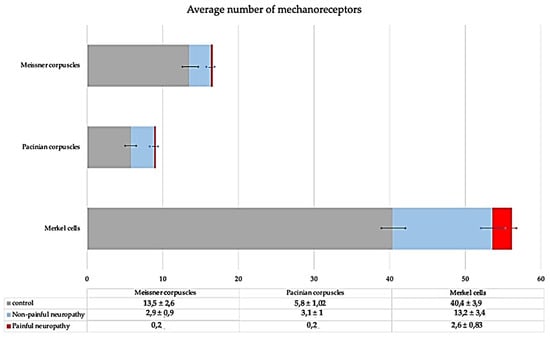 Thus, the present study was designed to analyze cutaneous sensory corpuscles from the feet of subjects undergoing painful and non-painful DDSN. We investigated changes in the density, size axonal, and Schwann-like cells of Meissner and Pacinian corpuscles as well as Merkel cell–neurite complexes. Furthermore, we analyzed possible changes in putative mechanoproteins detected on sensory corpuscles [23] which could be at the basis of mechanosensory impairment in DDSN.