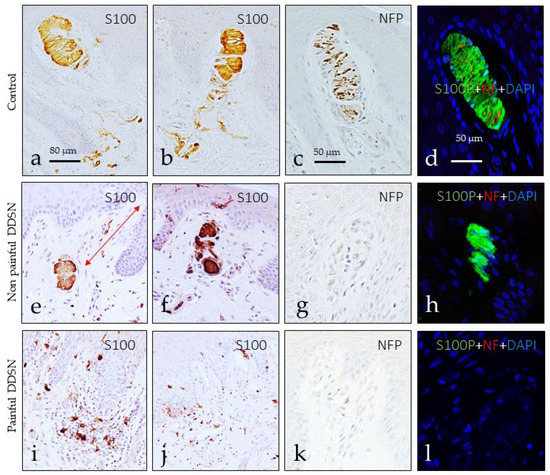 Differences in the morphology, size, number, placement within dermis, and intensity of immunostaining were observed among the three groups evaluated. In the control group, Meissner corpuscles were elongated and were always localized in the dermal papillae. The lamellar cells were packed, arranged in parallel, and displayed strong S100 protein immunoreactivity (Figure 2a,b). The axons showed immunoreactivity for NFP which run all over the corpuscle (Figure 2c), in an irregular course among lamellar cells (Figure 2d). In the NP DDSP patients, the predominant localization of Meissner corpuscles also was within the dermal papillae, but some were also displaced to the dermis (Figure 2e). Furthermore, the size was reduced, and the morphology was rounded. The lamellar cells were disorganized and unstructured form (Figure 2e,f), and the axon was sometimes unidentified (Figure 2g,h). The scenario changed dramatically in the P DDSP group in which Meissner corpuscles were not identified, and when identified morphologically they lacked S100P and NF protein (Figure 2i–k). Interestingly, in the dermis of P DDSP, abundant S100P-positive dendritic cells were observed (Figure 2i,j).
