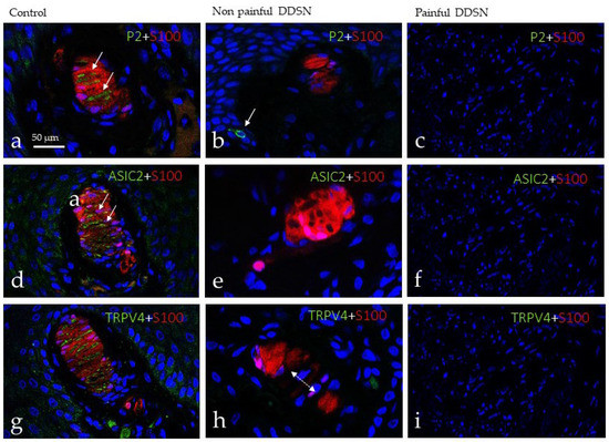 Mechanotransduction is the process which converts mechanical forces in action potentials, and in the skin, it occurs in mechanoreceptors, including Meissner and Pacinian corpuscles, and Merkel cell–neurite complexes (see [23]). In this process, some mechano-gated ion channels such as ASIC2, TRPV4, and, primarily, PIEZO2 [23] participate. Thus, we have investigated the possible changes in these mechanoproteins within sensory corpuscles during DDSP as a possible partial explanation of touch changes found in this disease. Using double immunofluorescence associated with confocal microscopy, we observed the occurrence of PIEZO2 (Figure 3a), ASIC2 (Figure 3d), and TRPV4 (Figure 3g) restricted to the axon, but not in the lamellar cells of Meissner corpuscles of control subjects. Immunofluorescence for all three mechanoproteins investigated was absent from Meissner corpuscles of both NP DDSP (Figure 3b,e,h) and P DDSP (Figure 3c,f,i).