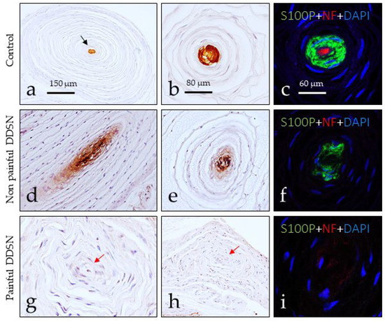 Evident changes were also noted in Pacinian corpuscles of DDSP patients with respect to the controls (Figure 4). The Pacinian corpuscles from normal subjects showed the typical onion-layer arrangement. The axon was placed at the center (displaying NFP immunoreactivity) of the corpuscle and was encircled by the lamellae of the Schwann-like cells that form the inner core (positive for S100 protein); outside these neural components are the intermediate layer, the outer core, and the capsule derived from the endoneurium and the perineurium (Figure 4a–c). In subjects with NP DDSP, the neural compartment of the Pacinian corpuscles (i.e., the axon and the inner core) was disarranged (Figure 4d,e), and no immunoreactivity for NFP was detected, nor in most axons (it was present in about 10%) or S100 protein (it was detected in about 15%). Nevertheless, the Pacinian corpuscles can be identified based on their morphology. Finally, in the Pacinian corpuscles from P DDSP patients, no immunoreactivity was detected for NFP or S100 protein (Figure 4g–i).
