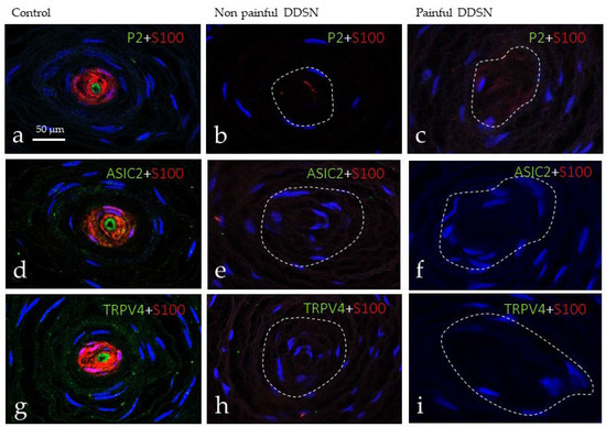 Double immunofluorescence for S100 protein, PIEZO2 (P2; (a–c)), ASIC2 (d–f) and TRPV4 (g–i) in cutaneous Pacinian corpuscles from control (a,d,g), NP DDSP (b,e,h), and P DDSP (c,f,i) patients. PIEZO2, ASIC2, and TRPV 4 were presented only in the axon of Pacinian corpuscles.